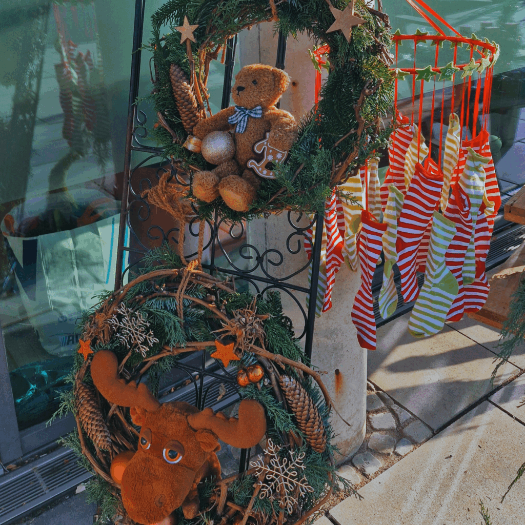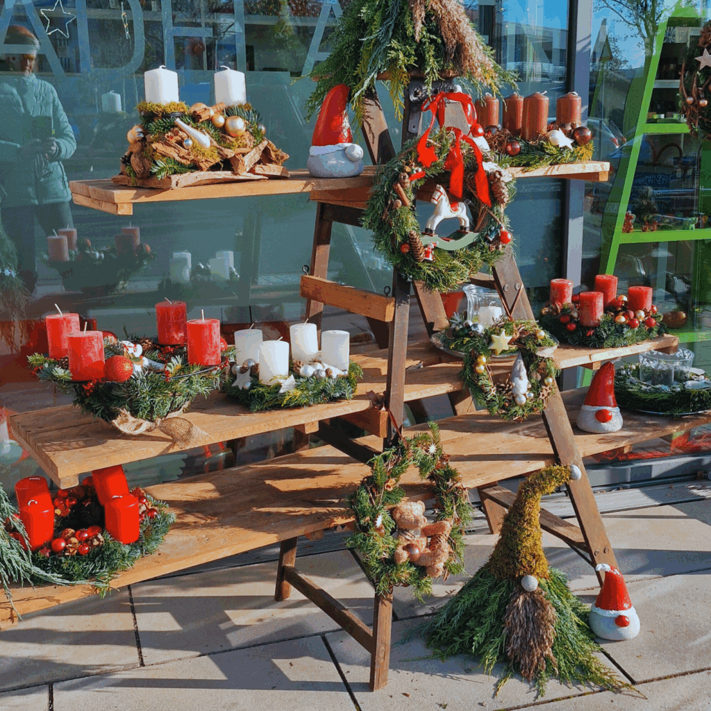 Jedes Stück war frisch gebunden und mit Kugeln, Kerzen und natürlichen Materialien dekoriert – kleine Unikate, die Adventsstimmung in jedes Zuhause bringen.